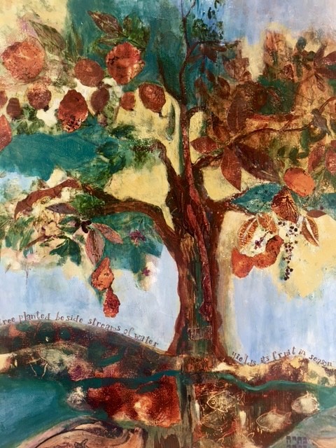 30X34 - mixed media Text: A tree planted beside streams of water...yields its fruit in season." --Psalm 1:3